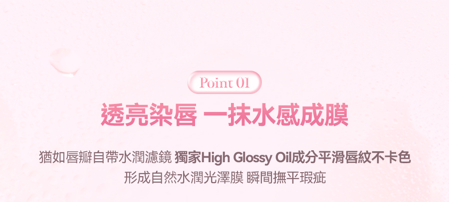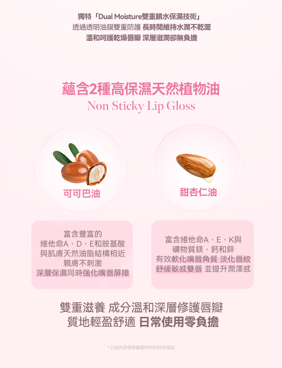 🌷獨家高光澤油×植萃潤唇成分 滑順不卡紋
